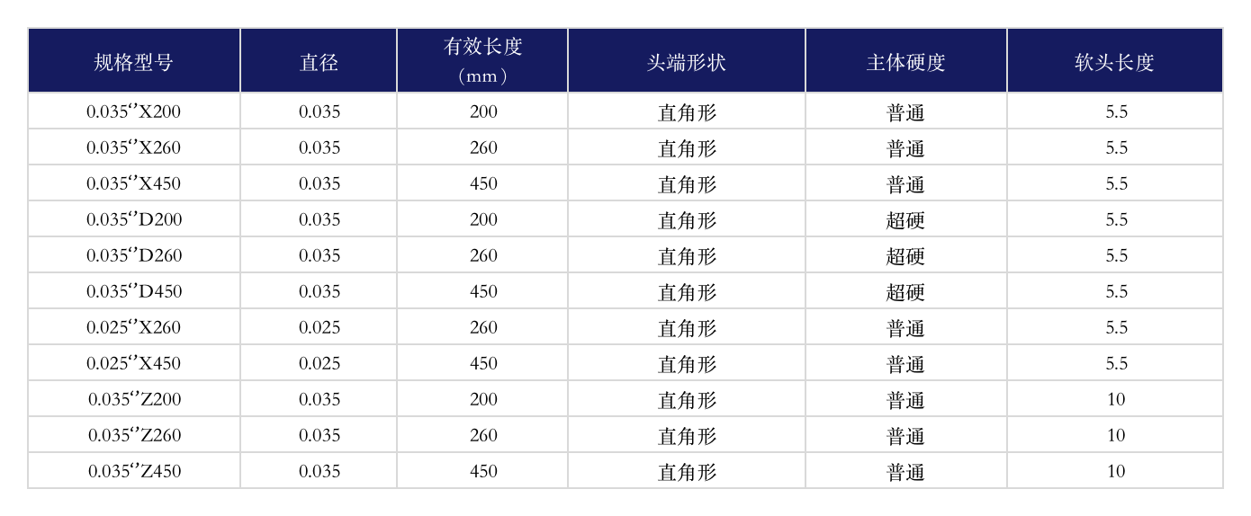 1、自潤滑;2、鎳鈦合金內芯;3、導絲表面采用雙色交替;4、可在X射線下顯影;5、喇叭口設計。