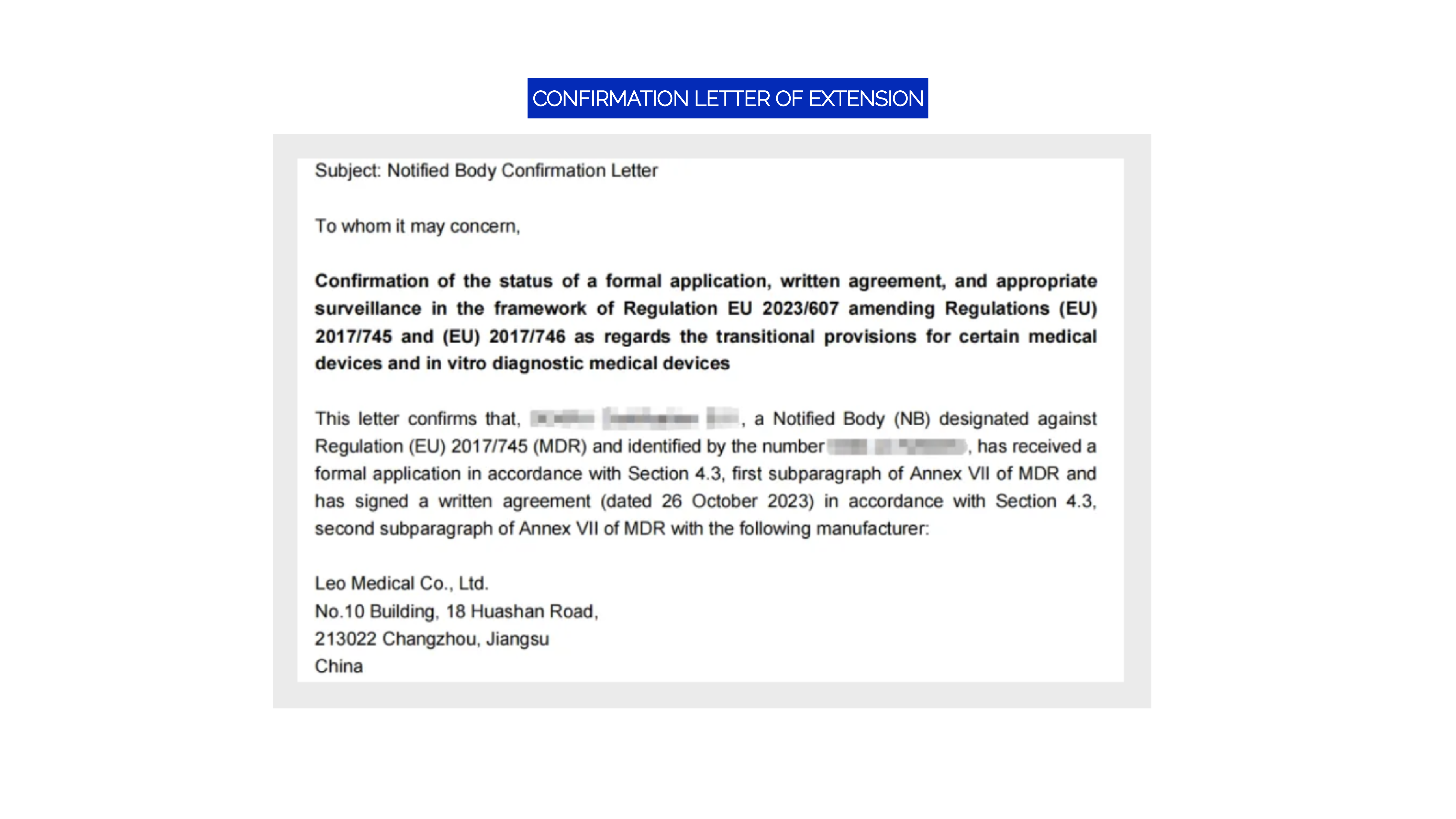 On June 20, 2024, Leo Medical received a confirmation letter issued by the notified body, explicitly stating that LEOMED has submitted a formal application for MDR conformity assessment in accordance with the EU's extended transitional provisions bill for MDR.  Both parties have signed the MDR certification contract. Since then, the MDD CE certificate has been successfully extended, allowing the original MDD certificate to remain valid until December 31, 2028.